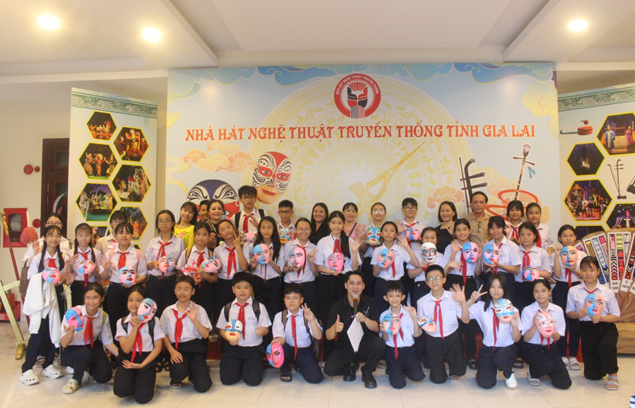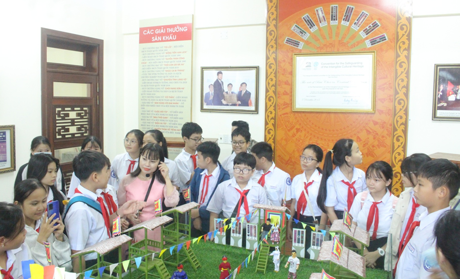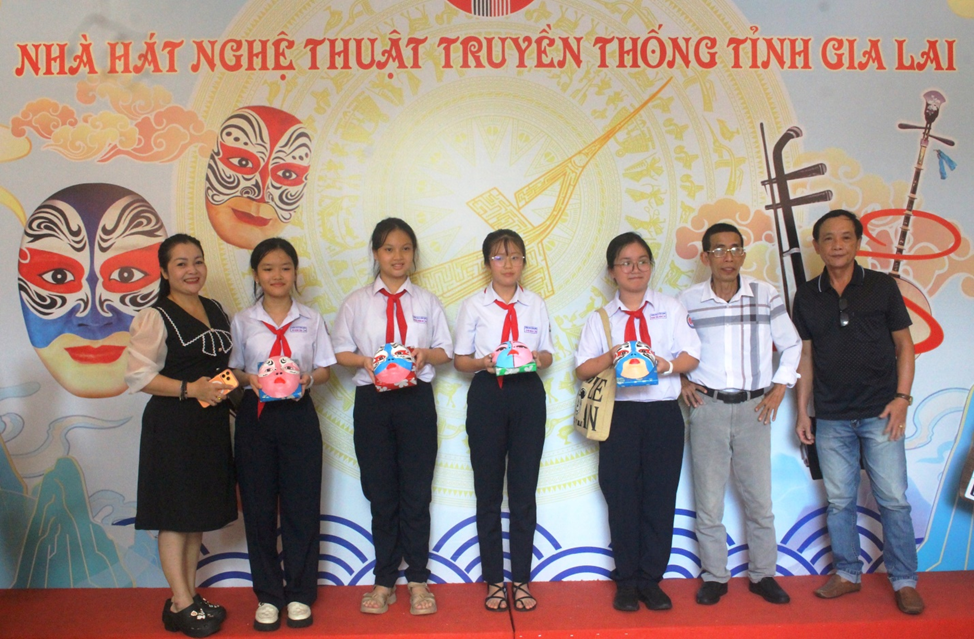 Tại chương trình, các em học sinh được tham quan Phòng truyền thống của Nhà hát, tìm hiểu những thông tin cơ bản về 2 loại hình nghệ thuật sân khấu truyền thống của tỉnh: nghệ thuật Tuồng và Ca kịch Bài chòi.