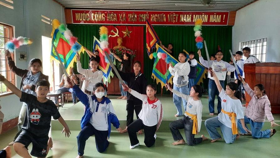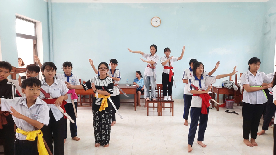 Các em học sinh tập luyện trích đoạn bài chòi “Anh hùng niên thiếu”