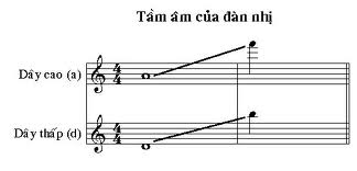 Về âm vực thì khoảng âm thường dùng từ nốt Sol (G3) đến nốt Rê (D5): tiếng Nhị chuẩn, đẹp, rõ ràng. Khoảng âm cao hơn một chút lên tới nốt Sol (G5), tiếng thanh, trong sáng. Khoảng âm cao quá, tiếng đàn rít, sắc đanh, gay gắt, đánh nhanh, không chậm và kéo dài. Để tạo âm điệu phong phú phục vụ diễn tấu các nhạc công lên dây đàn quãng 5 Sol - Rê, Rê - La hay Fa - Đô.