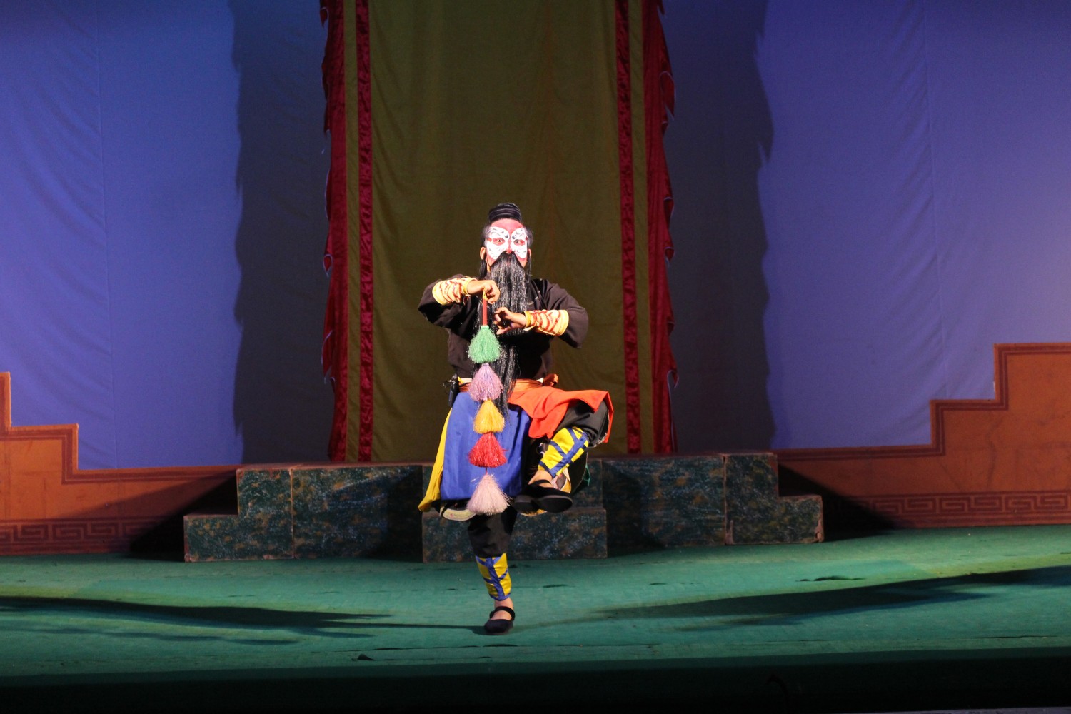 Diễn viên sử dụng roi ngựa trên sân khấu trong trích đoạn tuồng