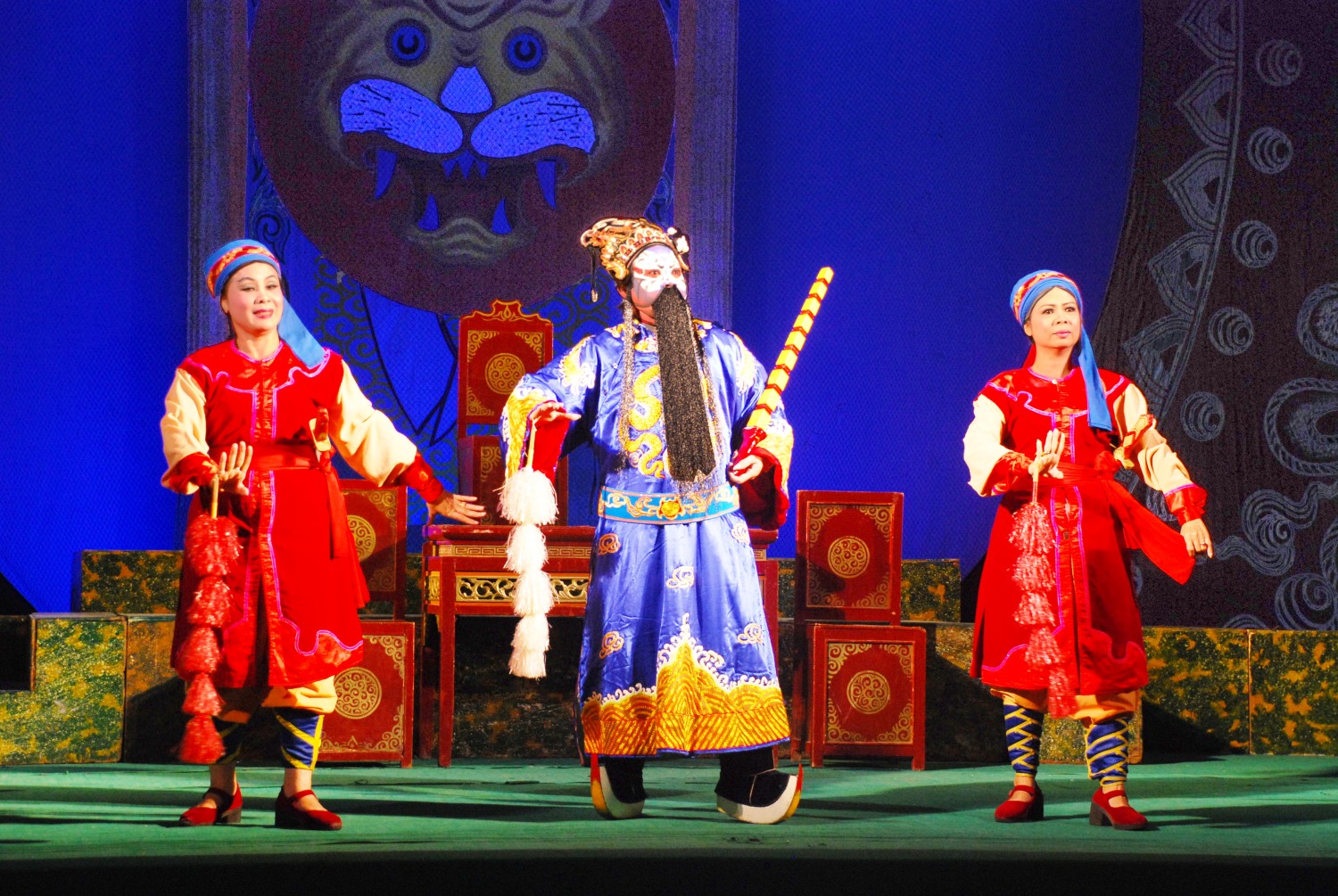 Diễn viên (ở giữa) kết hợp sử dụng roi ngựa và Kim giản trên sân khấu Tuồng